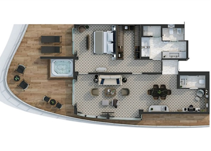 | O1 - Owner's 1 Suite 98 m² (vrátane balkóna 16 m²). Spálňa, oddelená obývacia a jedálenská časť, kúpeľňa s vírivkou. 8. paluba - stred. Max 3 osoby. | 35 400 € 35 400 € za osobu |