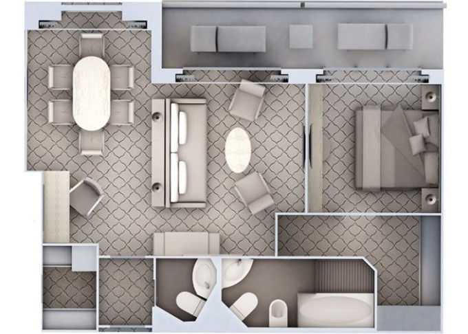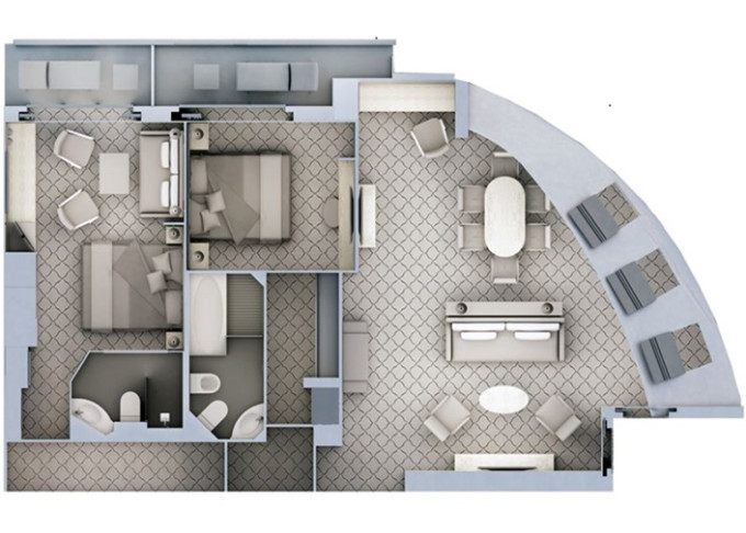 R2 - Royal Suite 2 79,5 m² + balkóny 16,5 m. Royal Suite R1 spojená s Veranda Suite. 6. paluba - vpredu. Max 5 osôb. 94 400 € 47 200 € za osobu