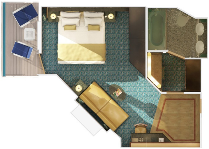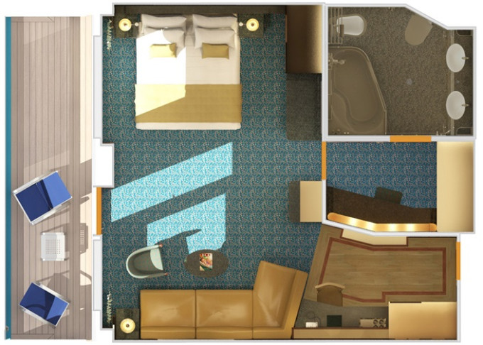 SS - Suite Cloud 9 Spa 25 m² / balkón 6 m². 11. paluba vpredu. Max 3 osoby. Výhody Suite. Voľný vstup do Spa a balíček Cloud 9 Spa. 2 164 € 1 082 € za osobu
