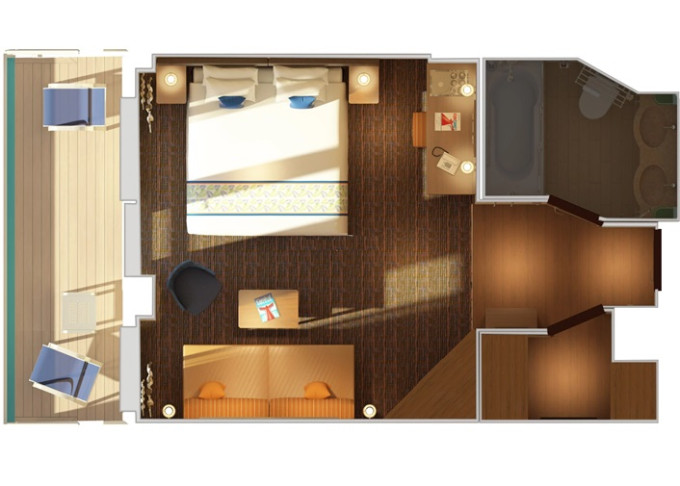 Kajuty sú navrhnuté pre maximálny komfort, balkón je ešte širší ako štandardný balkón, vďaka čomu sa získa ďalší vonkajší priestor.