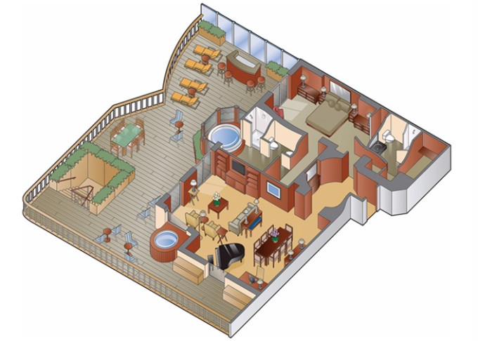 RS - Royal Suite 51 m² + balkón s vírivkou 18 m². Kúpeľňa s vírivkou. 6. paluba vzadu. Max 3 osoby. Výhody Suite The Retreat. 18 803 € 18 803 € za osobu