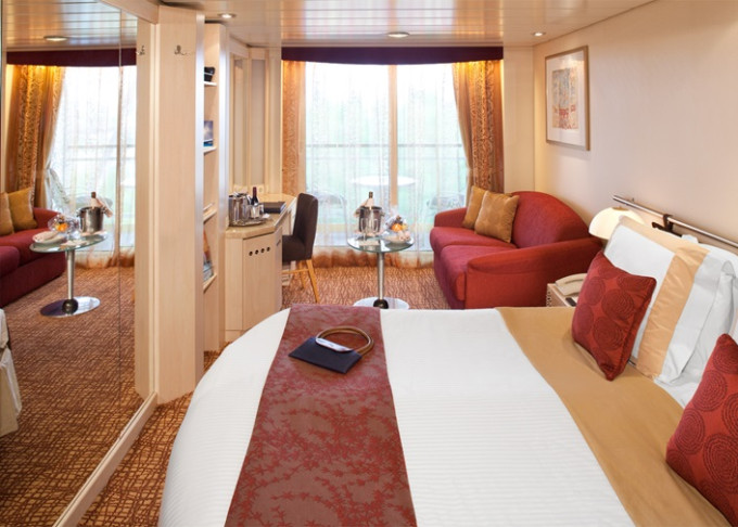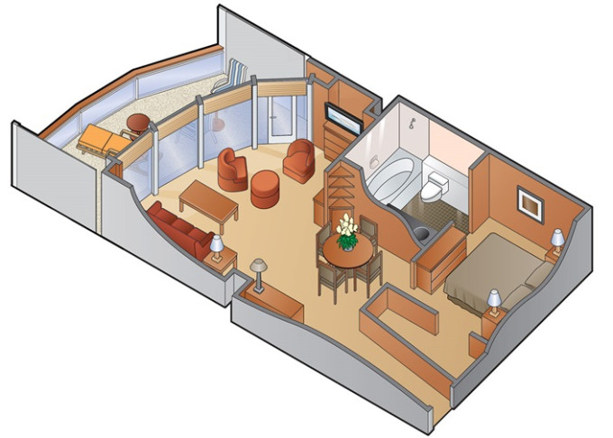 CS - Celebrity Suite 44 m² + balkón 8 m². Kúpeľňa s vírivkou. 6. až 9. paluba. Max 3 osoby. Výhody Suite The Retreat. 15 680 € 7 840 € za osobu
