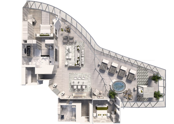 | IC - Iconic Suite s balkónom 176 m² + terasa s vírivkou 64 m². 2 spálne, 2 kúpeľne (1 s vírivkou).12. paluba vpredu. Max 6 osôb. Výhody Suite. | 32 848 € 8 212 € za osobu |