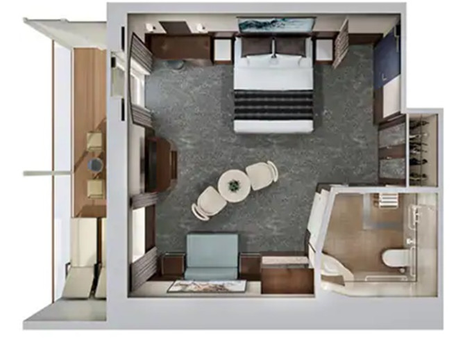 SE - Forward-facing Penthouse 51-52 m² / balkón 18-22 m². 8,9. paluba - vpredu. Max 3-5 osôb. Výhody Suite. 4 708 € 2 354 € za osobu
