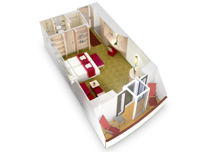 Vo všetkých kajutách sa nachádza regulovateľná klimatizácia, oddelené postele spojiteľné do jednej dvojitej, safe, kúpeľňa so sprchou, sušič na vlasy, telefón, Tv s plochou obrazovkou.