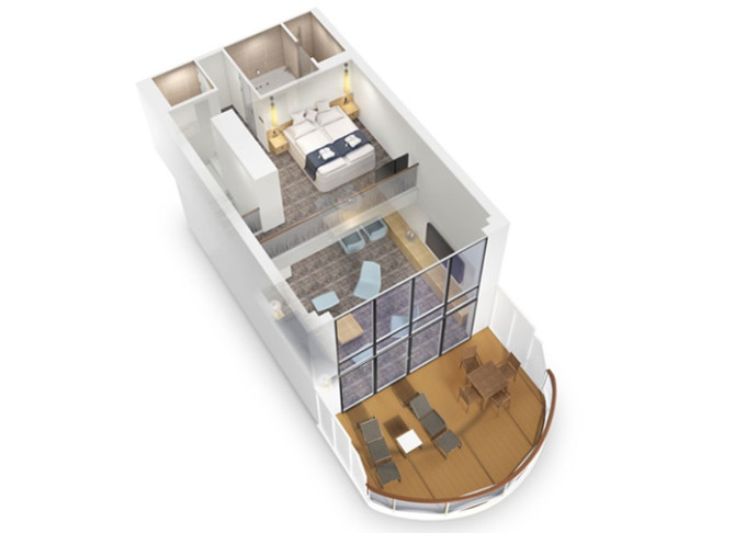 | DA - Kajuta s verandou Deluxe PREMIUM 21 m² + balkón 11 m². 9. až 14. paluba. Max 3 osoby. Cenový model Premium. | 2 340 € 1 170 € za osobu |