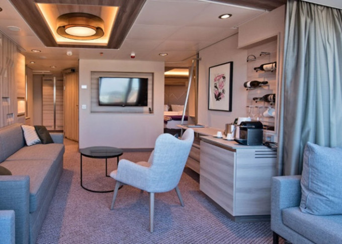 MD - Expedition Large Suite s balkónom ♿ 35 m². Balkón. TV, minibar, varná kanvica, kávovar. Bezbariérová kajuta♿ 7. paluba vpredu. Max 4 osoby. Výhody Suite. 25 284 € 12 642 € za osobu