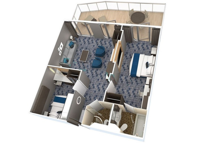 | 1A - Veľká kajuta s veľkým balkónom Ultra Spacious 25 m² + balkón 7,5 m². Oddelená časť s poschodovou posteľou. Max 6 osôb. | 6 800 € 1 700 € za osobu |