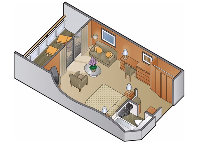 CS - Celebrity Suite 43 m² + balkón 8 m². Kúpeľňa s vírivkou. 6. až 9. paluba stred. Max 3 osoby. Výhody Suite The Retreat. 16 538 € 8 269 € za osobu