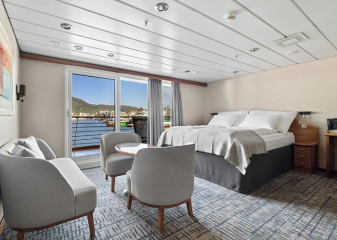 | M2 - Expedition Suite na hornej palube s balkónom 23 m². Balkón, obývacia časť, manželská posteľ, TV, varná kanvica, minibar. 7. paluba. Max 2 osoby. Výhody Suite. | 16 878 € 8 439 € za osobu |