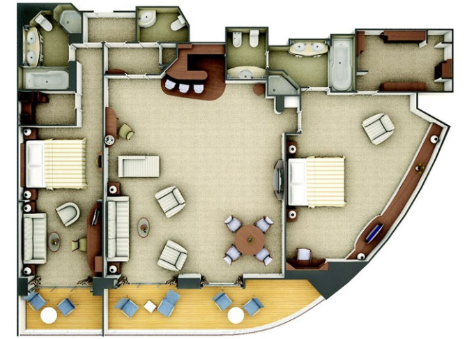 | O2 - Owner's Suite 2 107 m² + 20 m² balkóny. Owners Suite O1 spojená s Vista Suite. 7. paluba stred. Max 5 osôb. | 138 300 € 46 100 € za osobu |