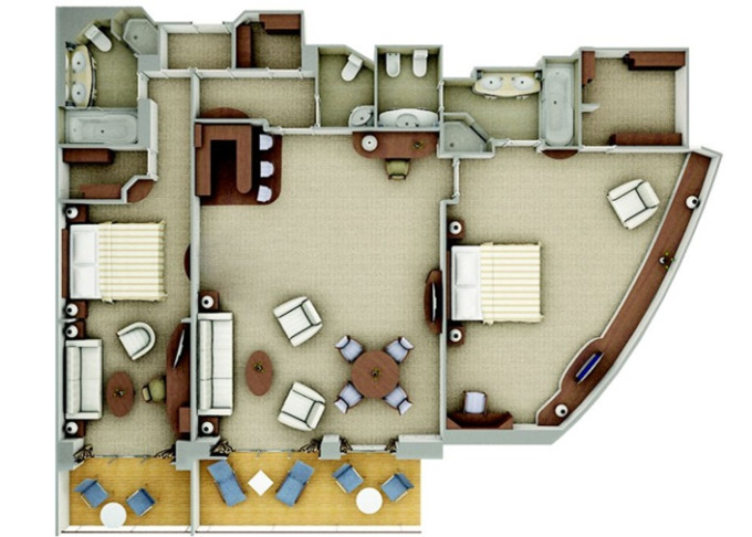| R2 - Royal Suite 2 105-110 m² + balkón 16-17 m². Royal Suite R1 spojená s Veranda Suite. 6,7. paluba vpredu. Max 5 osôb. | 105 300 € 35 100 € za osobu |
