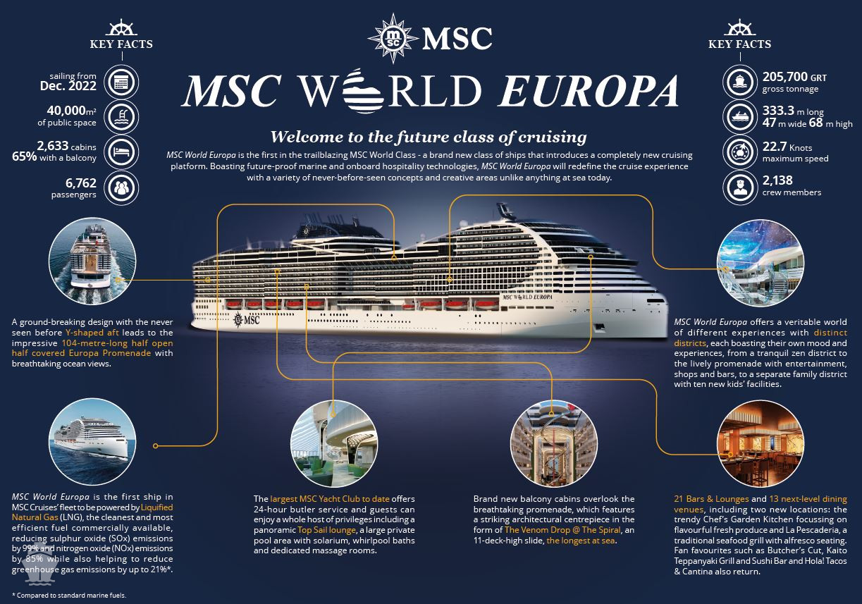 Prelomový dizajn lode MSC World Europa je založený na novej originálnej platforme. S nápadnou futuristickou siluetou v tvare šípu ľahko prerezávajúceho vlny, vertikálny 90-stupňový uhol čela lode má za účel zlepšenie stability a hydrodynamiky lode.