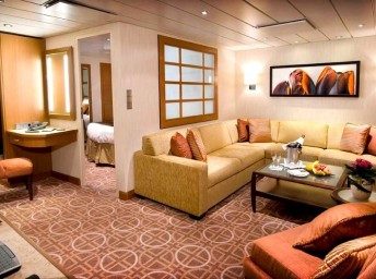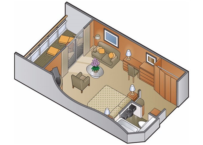 - Kajuty sú umiestnené v blízkosti lodného Spa. K ich vybaveniu patrí posilnený systém vzdušnej filtrácie, posteľ Queen-Size (v kategóriách Edge King-Size), veľké zasúvacie sklenené dvere, exkluzívne posteľné prádlo eXhale®, veľkorysé skladovacie priestory.
