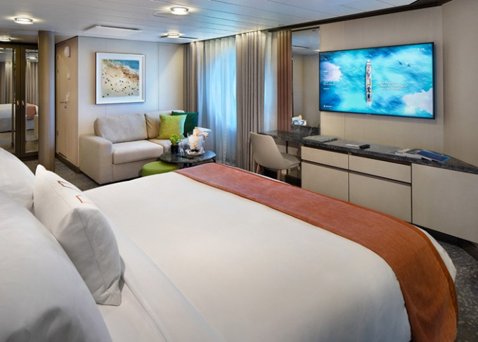 - Kajuty sú umiestnené v blízkosti lodného Spa. K ich vybaveniu patrí posilnený systém vzdušnej filtrácie, posteľ Queen-Size (v kategóriách Edge King-Size), veľké zasúvacie sklenené dvere, exkluzívne posteľné prádlo eXhale®, veľkorysé skladovacie priestory.
