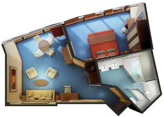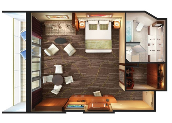 S6 - Deluxe Owner's Suite 61-68 m². Celoplošné neotvárateľné okná. 12. paluba - vpredu. Max 4-6 osôb. Výhody Suite. 4 648 € 2 324 € za osobu