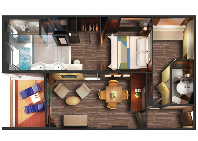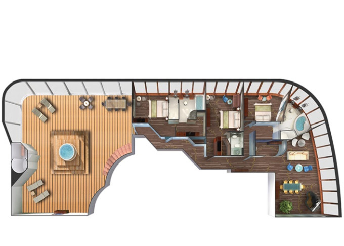 S2 - Deluxe Owners Suite s 2 balkónmi 78-83 m² / balkón 13 m². 10. paluba - vpredu. Max 4 osoby. Výhody Suite. 5 388 € 2 694 € za osobu