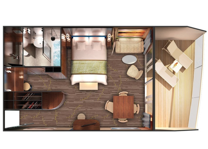SD - Forward-facing Deluxe Penthouse 47 m² / balkón 12 m². 10. paluba - vpredu. Max 4 osoby. Výhody Suite. 4 448 € 2 224 € za osobu