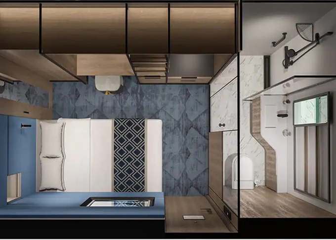 kúpeľna so sprchovacím kútom a WC, 2 lôžka (oddelené alebo spojené do manželského lôžka), v niektorých kajútách prístelok, toaletný stolík, úložné priestory, TV, trezor, telefon, fén na vlasy