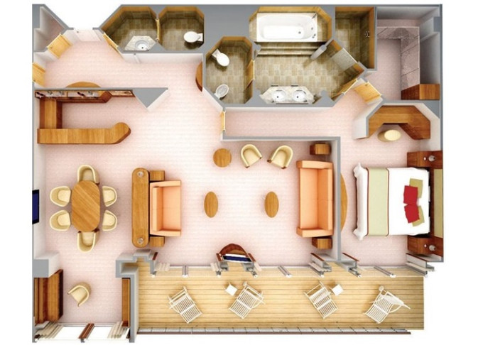 | R1 - Royal Suite 1 92 m² (vrátane balkóna 12 m²), Spálňa s obývacou a jedálenskou časťou. 7. paluba vpredu. Max 3 osoby. | 30 000 € 10 000 € za osobu |