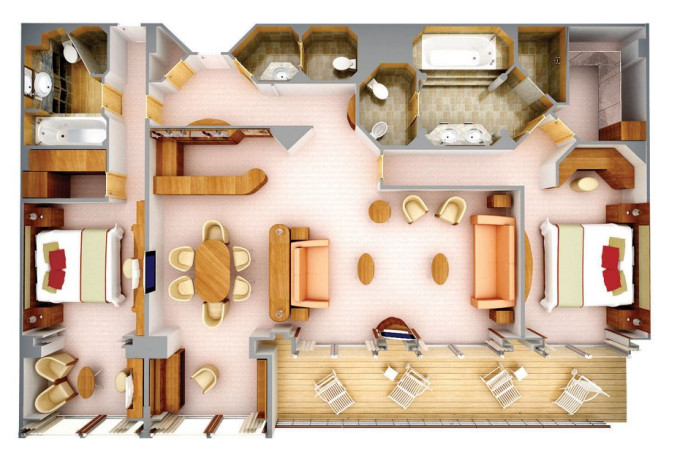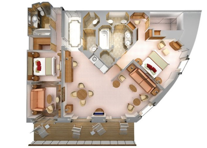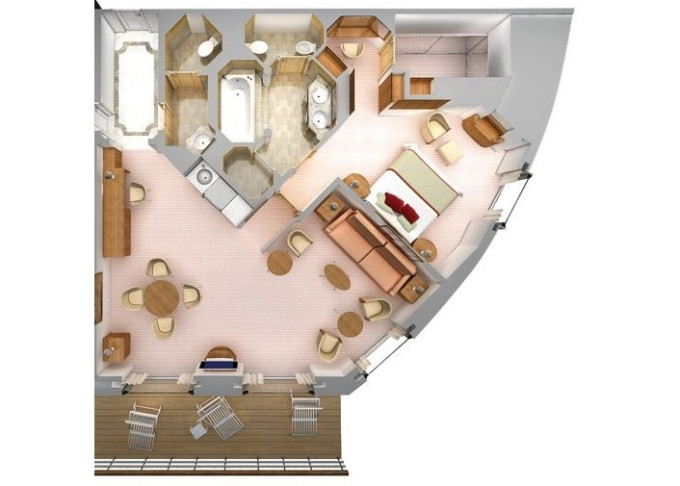 | R2 - Royal Suite 2 127 m² (vrátane 18 m² balkónov). Royal Suite prepojená s Veranda Suite. 7. paluba vpredu. Max 5 osôb. | 60 800 € 15 200 € za osobu |