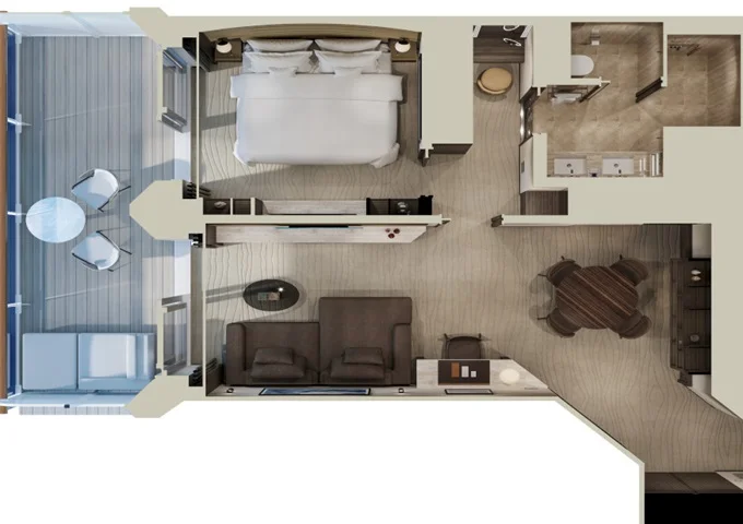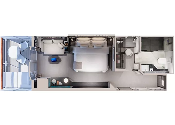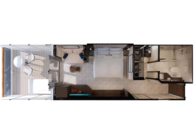 | Ocean Residence - Cove Residence Suita + terasa so sedením a lehátkami 56 m². Spálňa s obývacou a jedálenskou časťou, šatník. Koktailová súprava, minibar, kávovar, vodná kanvica, ďalekohľad, sejf, kúpeľňa so sprchou. Závesy, svetlo, klimatizácia ovládané smart technológiou. Taška Technogym Case Kit. Fľaša šampanského na privítanie. Maximálna kapacita 3 osoby. | 25 686 € 8 562 € za osobu | ||