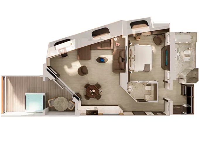 | Retreat Residence Suita 63 m² + Terasa s vírivkou a sedením 14 m² / 7. paluba: 18 m². Spálňa s obývacou a jedálenskou časťou, šatník. Koktailová súprava, minibar, kávovar, vodná kanvica, ďalekohľad, sejf, mramorová kúpeľňa s vaňou a sprchou, extra wc. Taška Technogym Case Kit. Fľaša šampanského na privítanie. Služby osobného majordóma. Maximálna kapacita 3 dospelí alebo 2 dospelí + 2 deti pod 18 rokov. | 36 452 € 9 113 € za osobu | ||