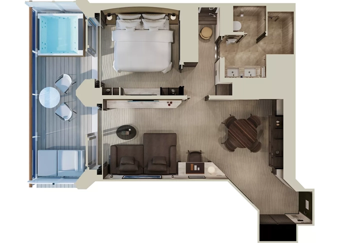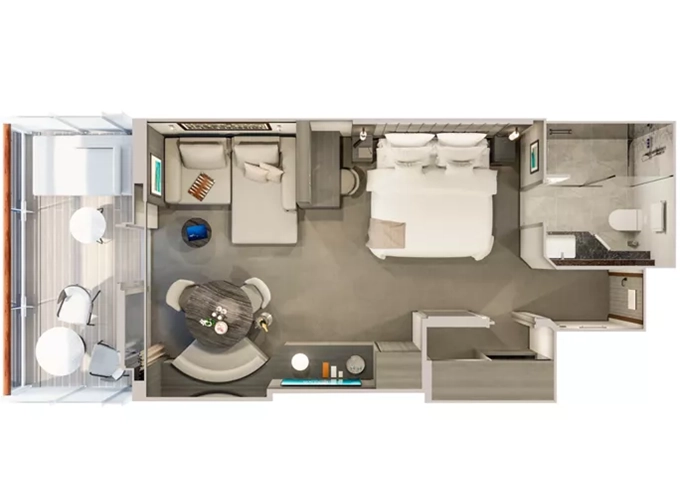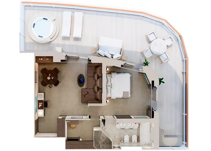 | Retreat Residence Suita 63 m² + Terasa s vírivkou a sedením 14 m² / 7. paluba: 18 m². Spálňa s obývacou a jedálenskou časťou, šatník. Koktailová súprava, minibar, kávovar, vodná kanvica, ďalekohľad, sejf, mramorová kúpeľňa s vaňou a sprchou, extra wc. Taška Technogym Case Kit. Fľaša šampanského na privítanie. Služby osobného majordóma. Maximálna kapacita 3 dospelí alebo 2 dospelí + 2 deti pod 18 rokov. | 42 520 € 10 630 € za osobu | ||