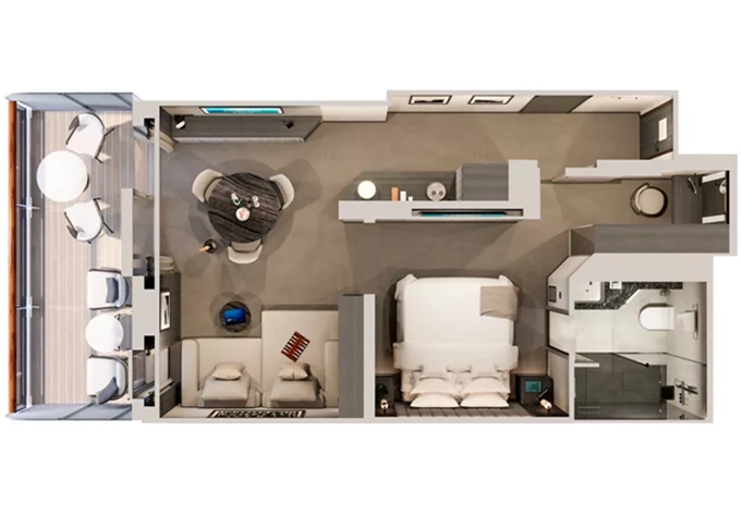 | Ocean Residence - Cove Residence Suita + terasa so sedením a lehátkami 56 m². Spálňa s obývacou a jedálenskou časťou, šatník. Koktailová súprava, minibar, kávovar, vodná kanvica, ďalekohľad, sejf, kúpeľňa so sprchou. Závesy, svetlo, klimatizácia ovládané smart technológiou. Taška Technogym Case Kit. Fľaša šampanského na privítanie. Maximálna kapacita 3 osoby. | 17 979 € 5 993 € za osobu | ||