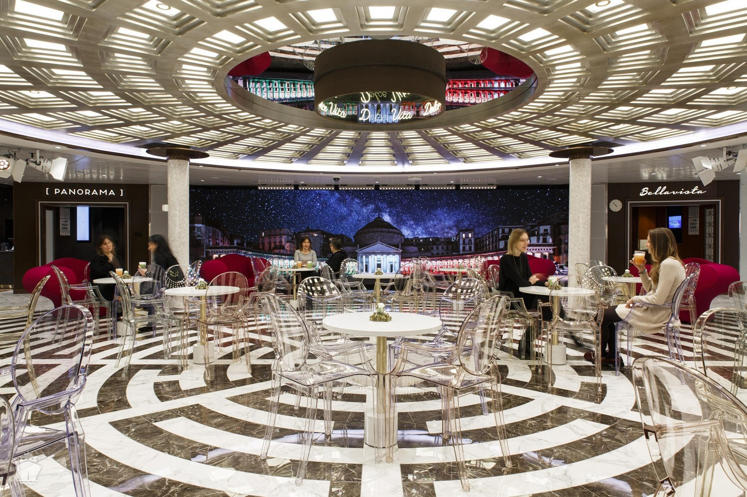 Terrazza Superba Bar na 7. palube na korme, benátsky Bacaro Bar, Bar Spazio Bollicine, Campari Spritz Bar, obľúbená zmrzlináreň - čokoládovňa Gellateria Amarillo.