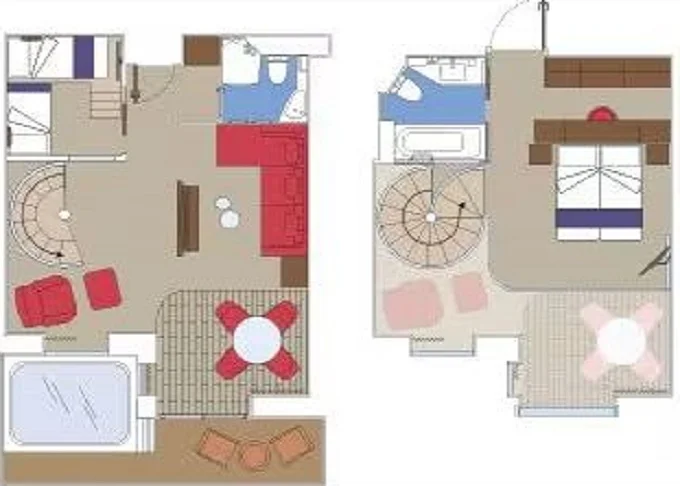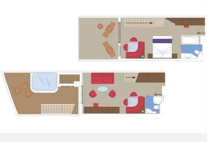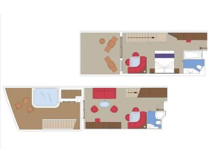| YJD - Yacht Club Duplex Suite s vírivkou 46 m² + balkón 30 m². Vírivka. 2 podlažia, šatník, 2 kúpeľne (1 s vaňou). Max 4 osoby. 16. paluba. Cenový model MSC Yacht Club. | 9 330 € 9 330 € za osobu | ||