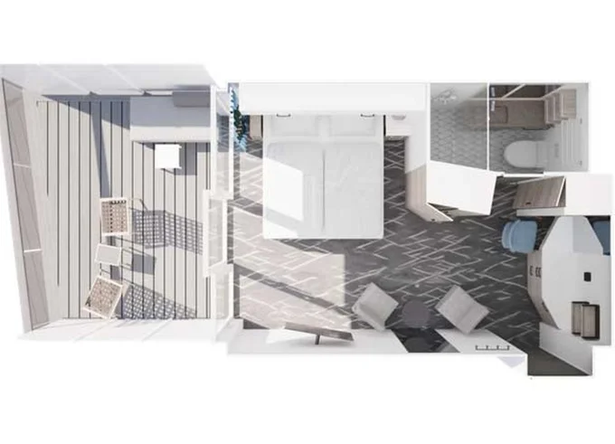 | VEKO - Kajuta s terasou 20 m² + balkón 13 m² so stoličkami a váľandou. 15. paluba. Max 2 osoby. | 3 382 € 3 382 € za osobu |