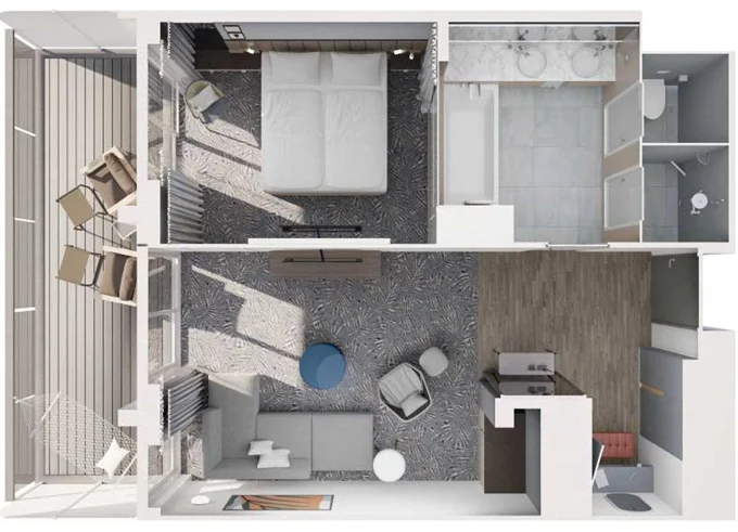 | SKWO - Weitblick Suite 45 m² + balkón 12 m² s hojdacou sieťou. Oddelená spálňa a obývacia časť, šatník. 14. paluba. Max 4 osoby. Výhody Suite. | 5 998 € 2 999 € za osobu |