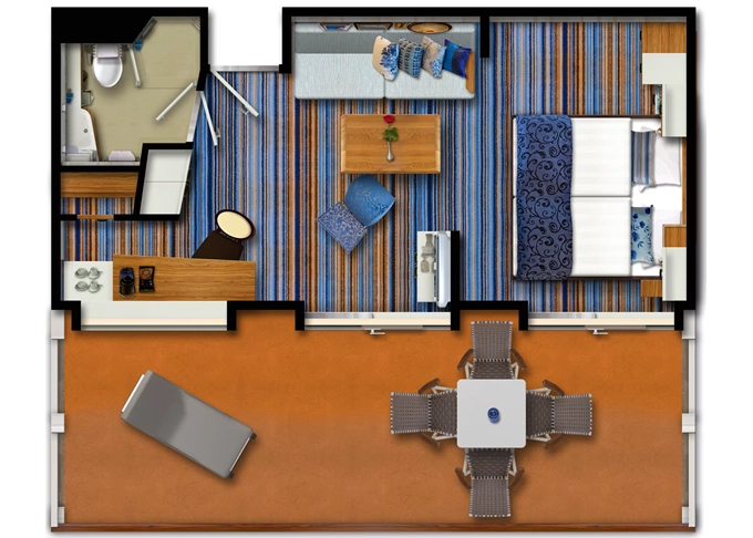 | FVDO - Rodinná kajuta Veranda Deluxe 42 m² + balkón 47 m² so stolom, 4 stoličkami a 2 ležadlami. Hracia konzola. 6. paluba. Max 6 osoby. Cenový model PUR | 3 588 € 1 196 € za osobu | ||