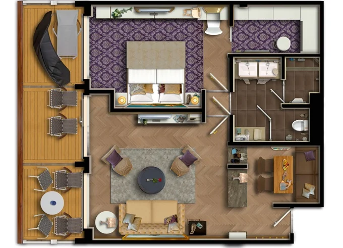 | SUTO - Themen Suite 54 m² + balkón 15 m² so stolom, ležadlom a hojdacou sieťou. Spálňa, obývacia časť, šatník. 10. paluba. Max 4 osoby. Výhody Suite. | 6 296 € 1 574 € za osobu | ||