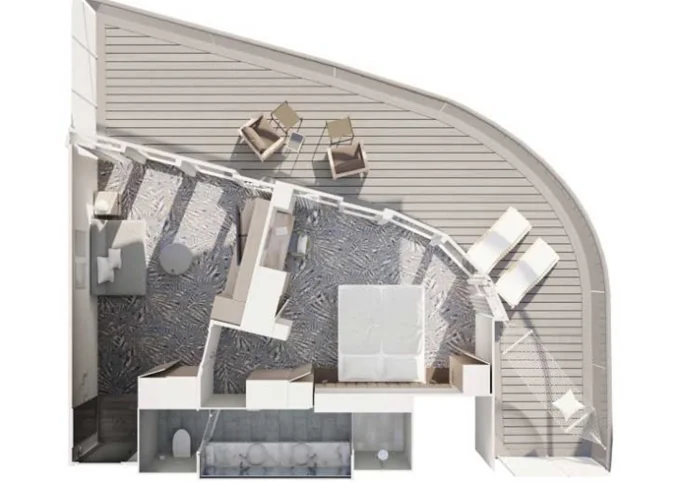 SUGO - Große Freiheit Suite 88 m² + balkón 43 m² so stolom, ležadlami + balkón s hojdacou sieťou. 2 spálne, 2 kúpeľne, šatník, infračervená sauna. 9,10. paluba. Max 6 osoby. Výhody Suite. 28 854 € 4 809 € za osobu